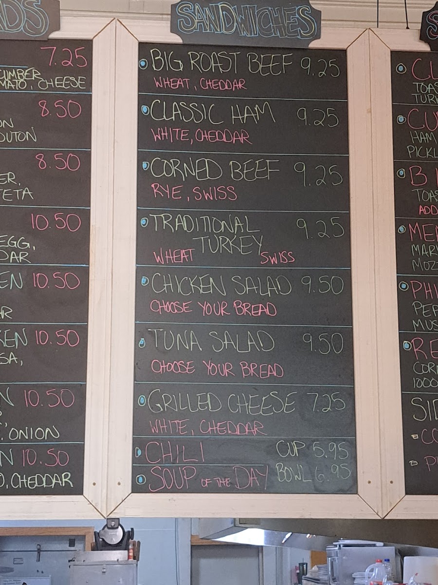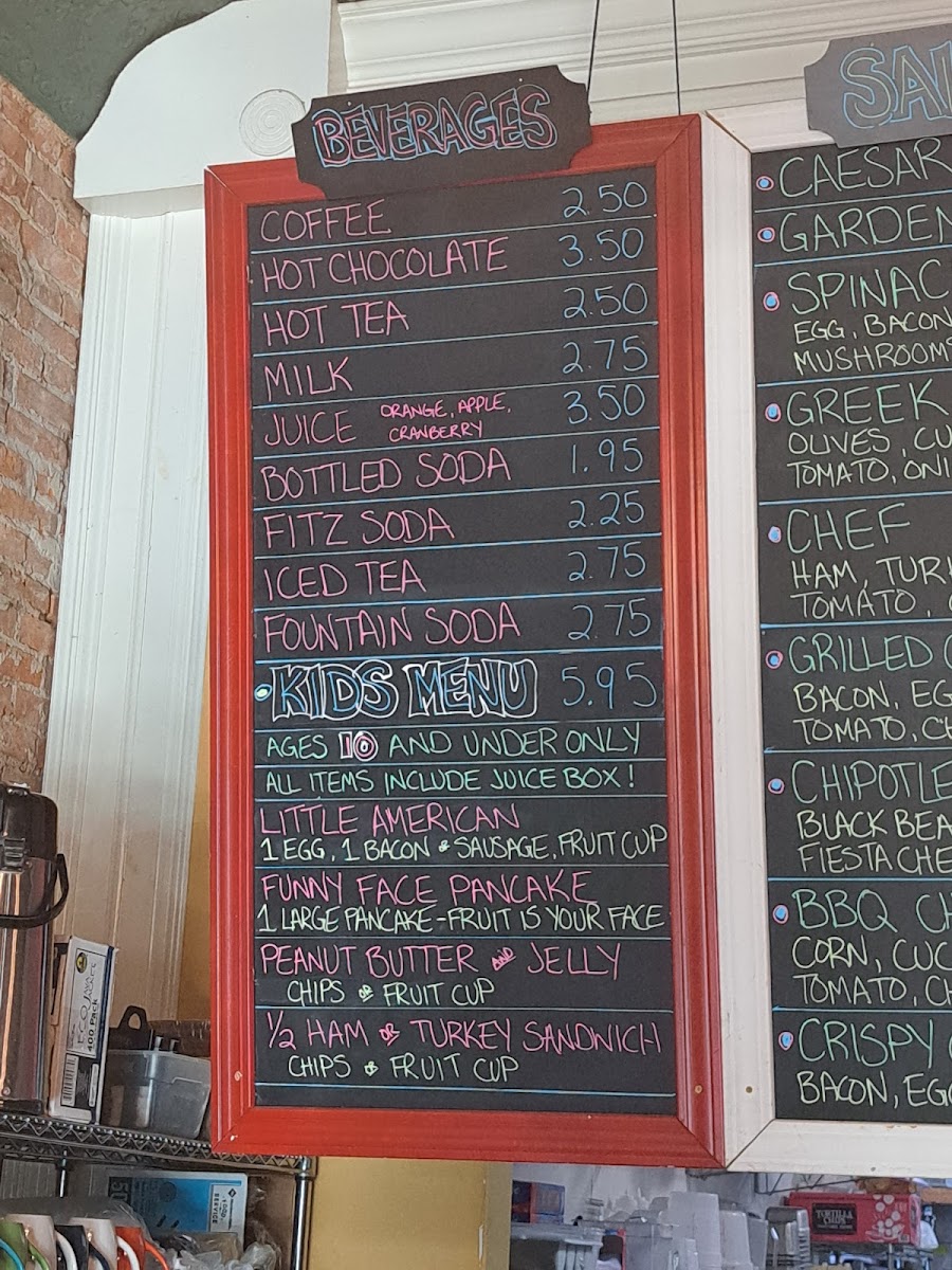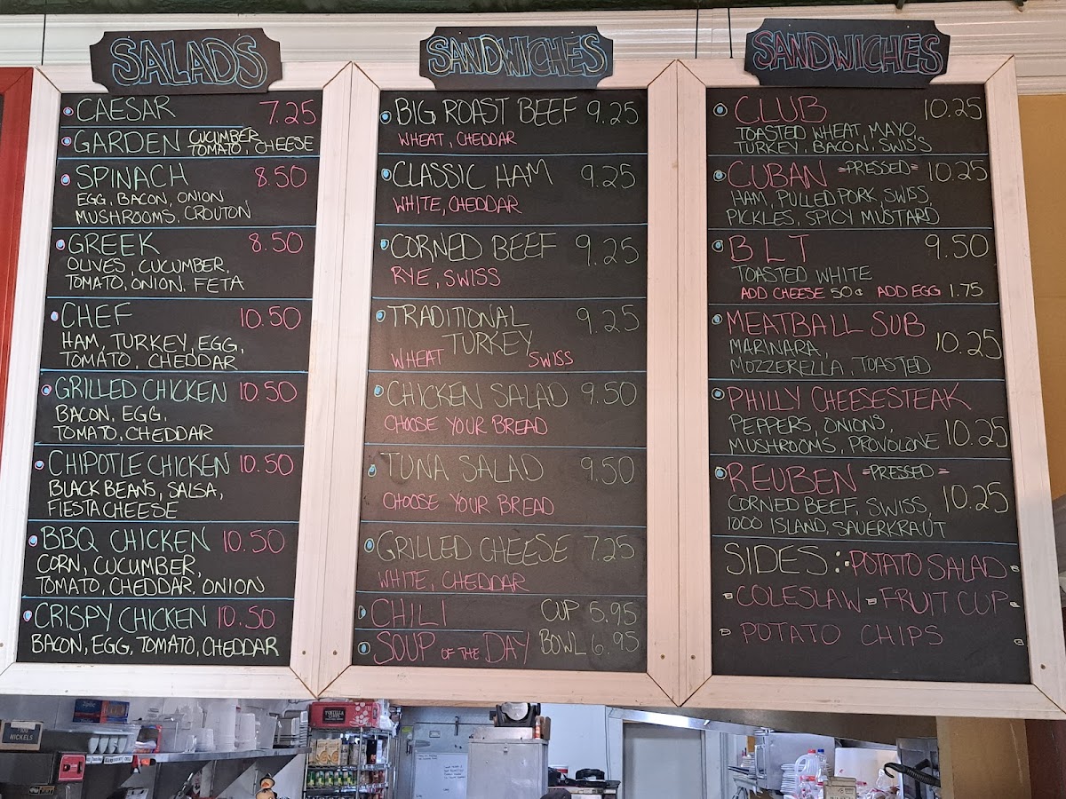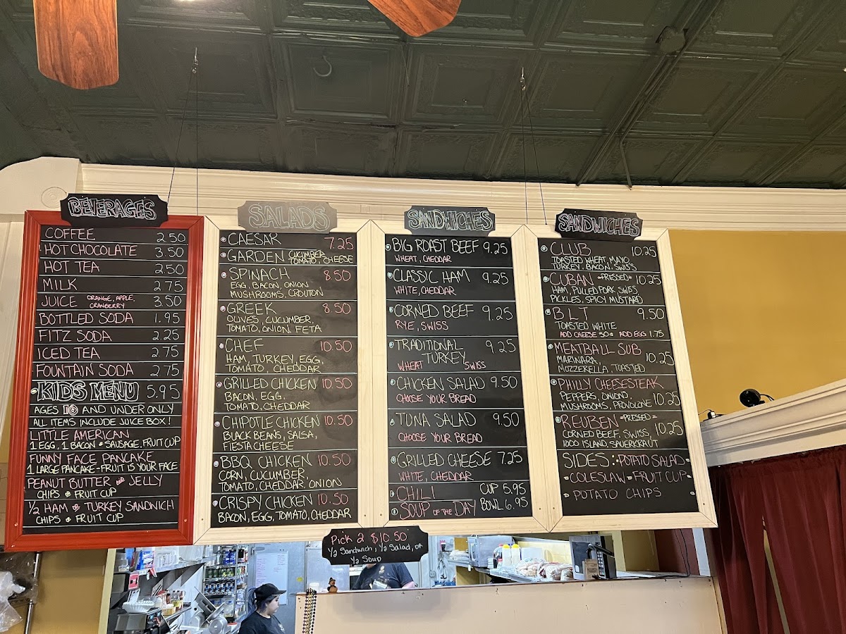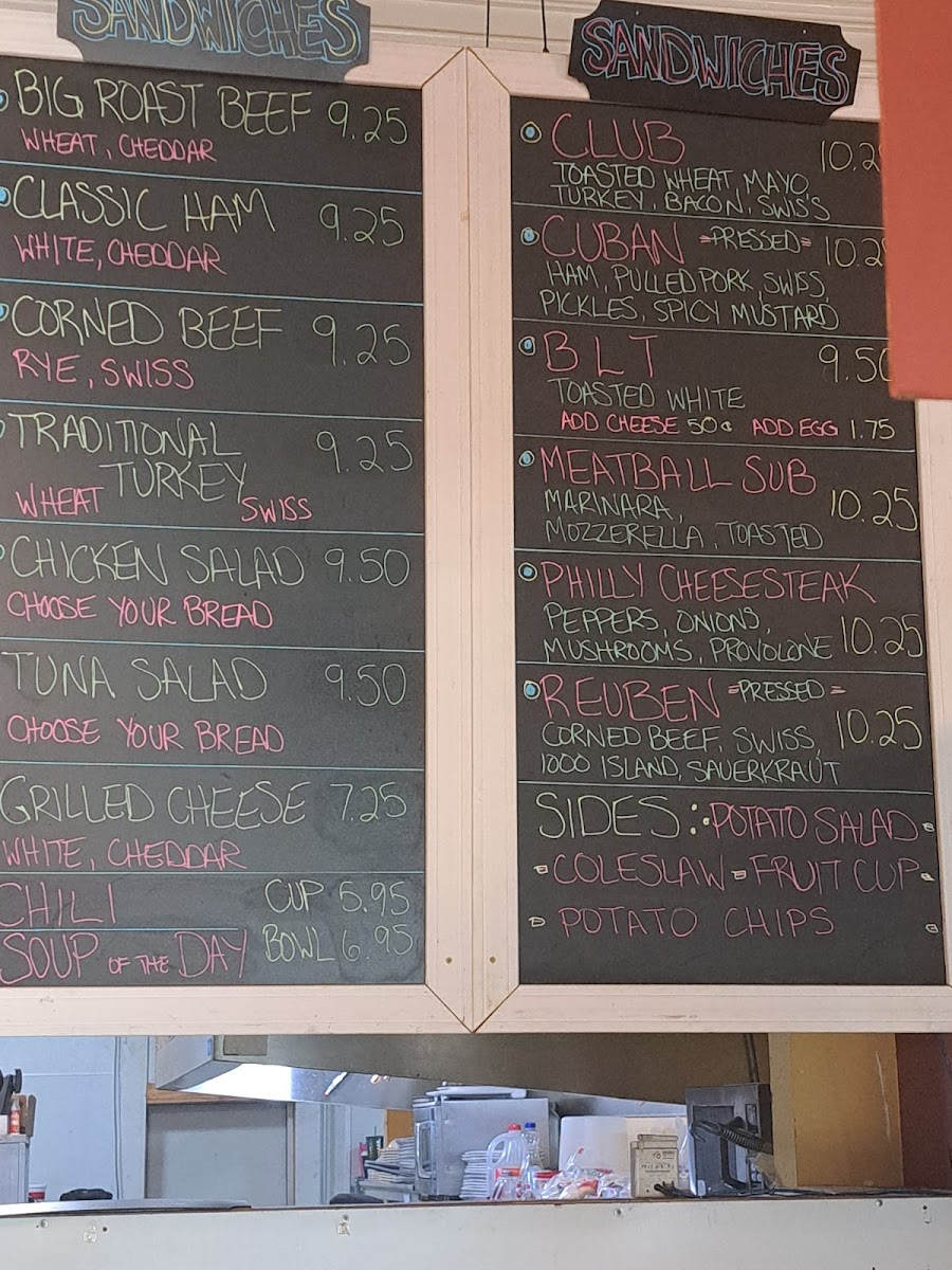 The menu features hearty breakfast staples like the Everything Plate and traditional omelets filled with eggs, cheese, and your choice of meats or vegetables, alongside lighter options such as fresh fruit or salads. Savory sandwiches like the Cuban Sandwich or Reuben offer a satisfying lunch option, while cozy soups and comforting sides like Biscuits and Gravy complete the lineup.